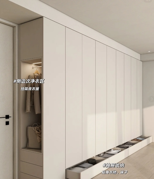 比如在衣柜的侧面,可以设计为次净衣服收纳区,这样每天换下来的衣服,就可以直接挂在上面整齐又好用。