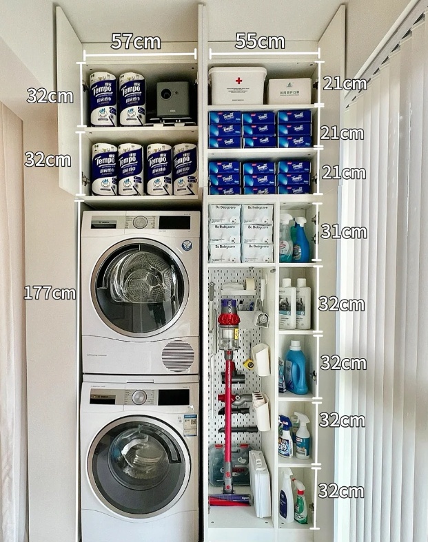 我们可以把剩余的部分设计为杂物收纳柜,放一些日常的囤货或者是洗涤产品,都非常的好用。