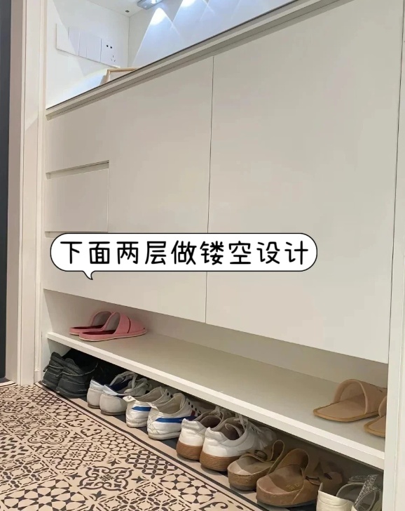 建议各位小伙伴,可以把玄关鞋柜设计为两层开放格,这样上层放拖鞋,下层放外面的鞋子,内外分开更干净。